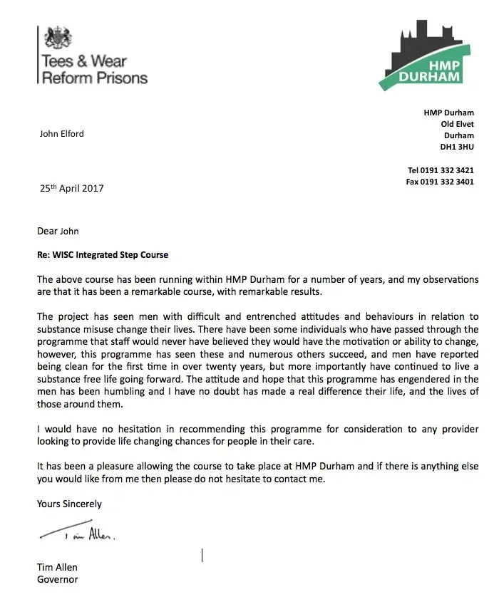 HMP Durham were ecstatic to implement the Standard Model Integrated Step Course on their recovery wing. It was evaluated by the prisons IMB as a valid, worthwhile and cost effective programme that creates an environment conducive to recovery.