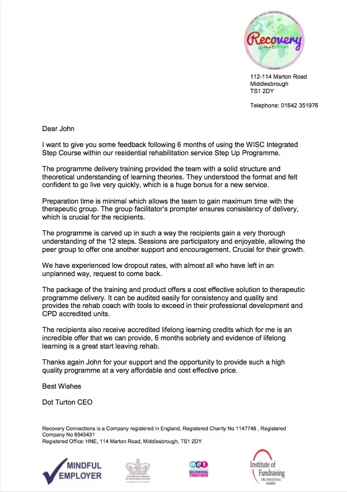 Recovery connections implemented our Step Course a while ago to bring structure and direction to their services. The course is mentioned as one of the contributing factors in them receiving an 'Outstanding' award from the CQC.